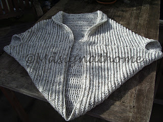 Hij is af...... mijn Shrug het was best een groot project maar nu zit ik 's avonds heerlijk warm..... de omgeslagen rand heb ik met een ouderwetse leren knoop vastgezet, aan de voorkant een grotere leren knoop (die er na de foto's is opgezet) ik ben er zo blij mee.