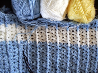 Voor de verandering heb ik weer een babydekentje onder handen, het is de bedoeling dit in blauw, wit en geel te maken, maar dit is het laatste bolletje geel...... en ik heb nog geen nieuwe kunnen